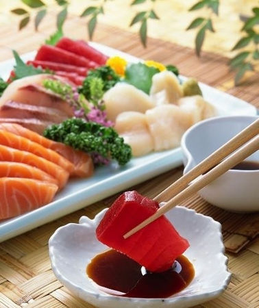 日本人自称为“彻底的食鱼民族”。日本捕鱼量居世界第一位,但是每年还要从国外大量进口鱼虾,一年人均吃鱼100多斤,超过大米消耗量。日本人吃鱼有生、熟、干、腌等各种吃法,而以生鱼片最为名贵。国宴或平民请客以招待生鱼片为最高礼节。日本人称生鱼片为“沙西米”。一般的生鱼片,以鲣鱼、鲷鱼、鲈鱼配制,最高档的生鱼片是金枪鱼生鱼片。开宴时,让你看到一缸活鱼,现捞现杀,剥皮去刺,切成如纸的透明状薄片,端上餐桌,蘸着佐料细细咀嚼,滋味美不可言。不吃生鱼的外国人,尝了一次便想吃第二次了。