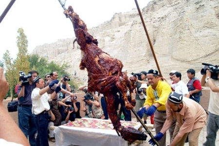 阿拉伯国家国宴最爱用、也最受欢迎的一道菜是烤全羊。烤熟的整羊放在桌上,旁边有切好的生洋葱和其它调味品,任客人持刀割肉自行享用。