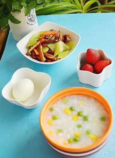 16、玉米青豆粥+胡萝卜莴笋炒笋+白煮蛋+草莓