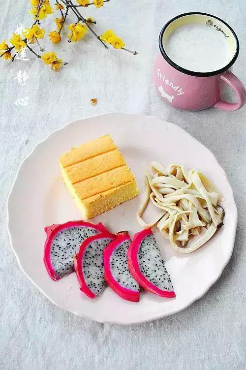 25、海绵蛋糕+椒盐杏鲍菇+火龙果+牛奶麦片