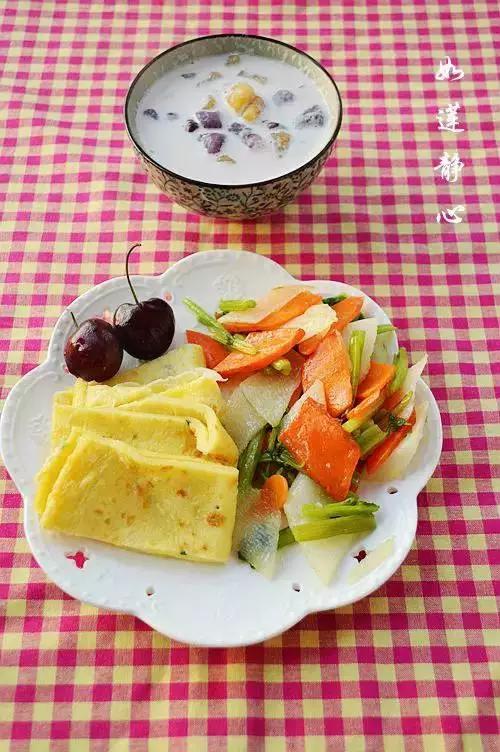 26、蛋饼+胡萝卜山药炒芹菜+樱桃+小圆子