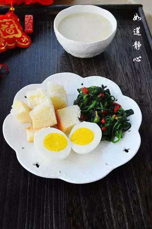 28、小米大米粥+枸杞拌菠菜+烤面包+白煮蛋