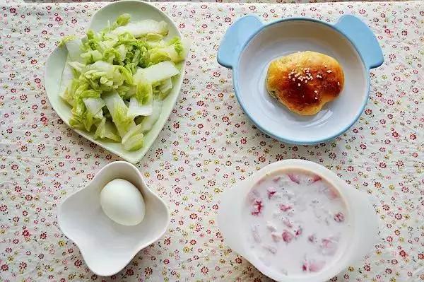 38、小餐包+草莓牛奶麦片+炒白菜+鸡蛋