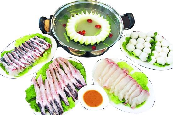锅底采用鱼龙骨、鱼肚、刚入港的新鲜杂鱼等十几种底料,经过十几个小时慢火熬制。大厨在锅底中置入清凉降火的冬瓜,既增添了鲜美的口感,又起到清凉降火的功效。店内常年供应来自深海、远离污染的石斑鱼,你可以根据自己的需要向大厨点取你想要的石斑鱼部位,加入火锅中烹调,原本的鲜味高汤渗透到晶莹剔透的鱼肉中,再配上店家秘制的酱料,美味绝伦。