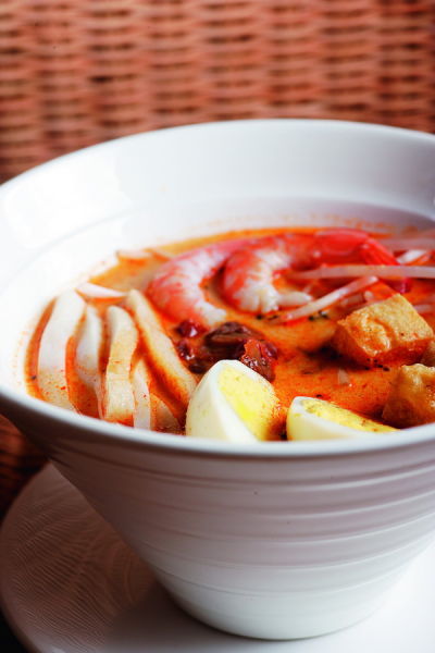 叻沙口味香浓辛辣,以粗米粉为主料,汤料以椰浆、叻沙叶和辣椒为主,在煮滚的清汤里加入叻沙酱、叻沙叶、辣椒、香茅、蓝姜、虾米等,慢火熬制两个小时以上,再加入淡奶和椰浆,调制出浓郁的叻沙汤。这时,将粗米粉和豆芽烫热,与鱼饼、鲜虾、鲜蛤混在一起,浇上叻沙汤,就大功告成了。叻沙叶是制作叻沙的关键,这种香草在未被人们食用前,曾经被归为杂草,如今摇身一变,成了娘惹菜里的宠儿。
