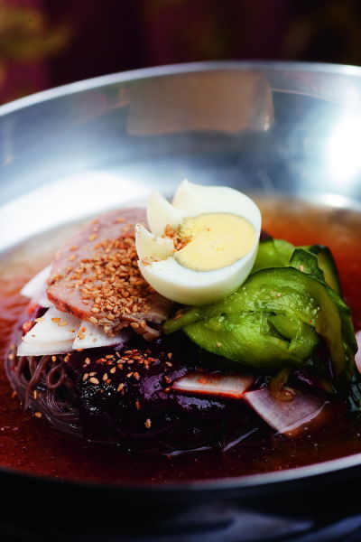 韩国冷面的主料是荞麦面或者葛根面,面条较细。在制作的方法上,韩国冷面分为水冷面和拌冷面两种,前者通常用凉汤(一般是牛肉高汤)制作,后者用辣椒酱等辣味调料拌着面条吃。在吃冷面的时候,醋和芥末酱是必不可少的调料,每个人可以根据自己的口味来添加。