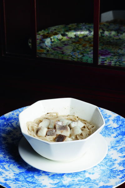而当黄鱼雪菜面进入了高档餐厅,就摇身一变——黄鱼只取背部结实的肉块,切成小方块入菜,其他的部位连同鱼骨用来熬汤底;雪菜炸脆后磨成粉状洒再面里,这样面条中既有雪菜特殊的鲜咸之味,又不会黏牙;面条改汤面的做法为煨面,使得汤味更加渗入面条,让人吃过后意犹未尽;最后,再将传统的大碗改成订制的中碗,外形典雅又有海派风韵,黄鱼雪菜面就完成了华丽的变身。