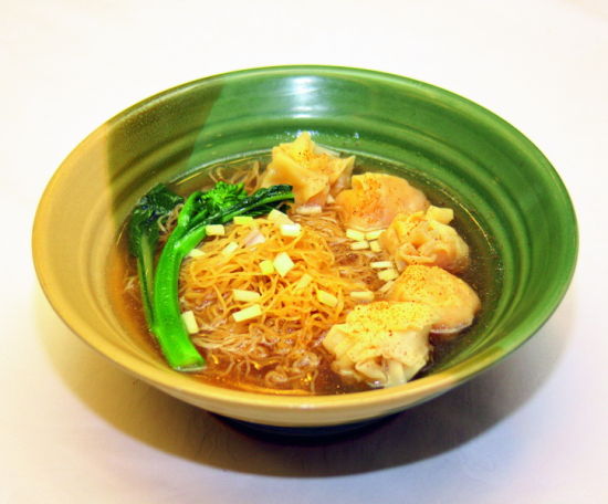 制作云吞面的汤底很重要。考究的餐厅会用猪骨、瘦肉和大地鱼(煮汤前需要先烤一下)做主料,辅以虾皮、虾籽、罗汉果、红枣和白胡椒,花5小时时间熬成,颜色清澈,更显出面条的黄色和云吞中鲜虾仁隐隐的红色。最后,面条里要放上一丝韭黄丝,增加绿色之外,也使口感清脆。
