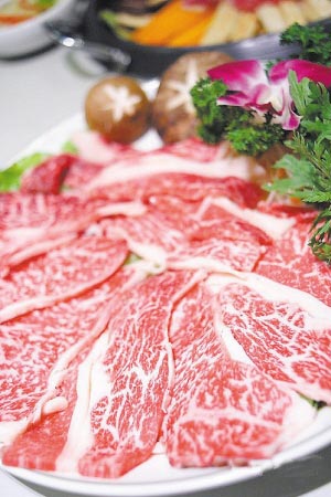 最弹眼落睛的是鲜滑面,一个鲜滑面筒放在晶莹凉爽的冰上,非常新奇!经耐心的服务生示范解说才恍然大悟:可以自已DIY制作,是由鲜滑与日本进口风车粉混合上千次捶打制作 而成,既鲜又Q的面条.冰鲜雪花牛肉也非常特别,是选用上等大理石花纹牛肉,从宰杀到食用仅7天,是吃谷物自然育肥的牛肉,因此非常鲜嫩多汁.
