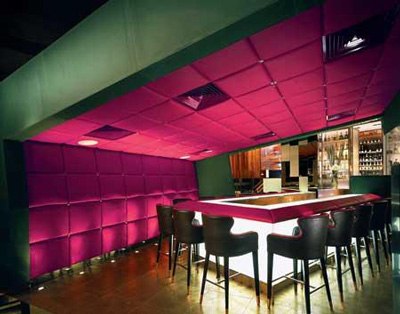酒吧鲜艳的紫罗兰色和堆砌着几何图案地毯、谐意的沙发真丝靠垫,再配合窗外华丽的外滩夜景和优美的古典建筑江岸,把整个酒吧的色调烘托得完美无比。