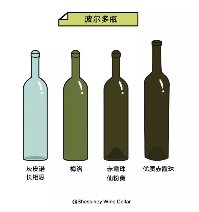 这是最常见的瓶形,因波尔多产区知名,主要由梅洛、赤霞珠、长相思(白葡萄酒)酿造。也常被称为波尔多瓶。
