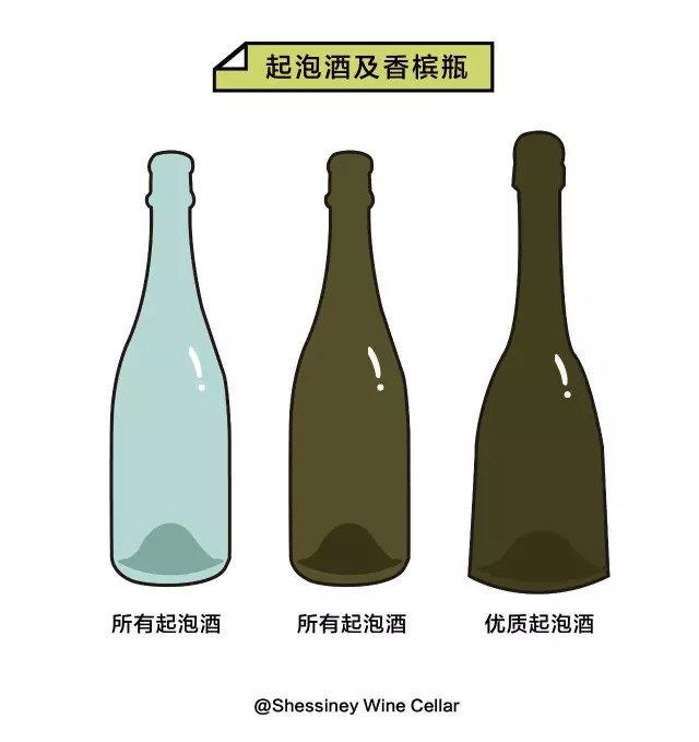 通常起泡酒瓶要更重一些,因为它们必须要承受起泡酒中7个大气压的压力。有些瓶底会有平坦,有些则不是。通常设计订做的瓶形用于高级起泡酒。