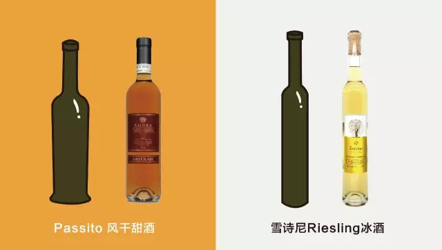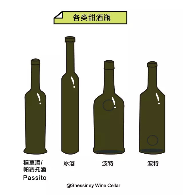 甜酒瓶的风格更多的来源于传统。这些酒瓶比一般的品种更华丽一些。生产者加上定制的图章或封印。不同的形状表面了不同类型的甜酒。