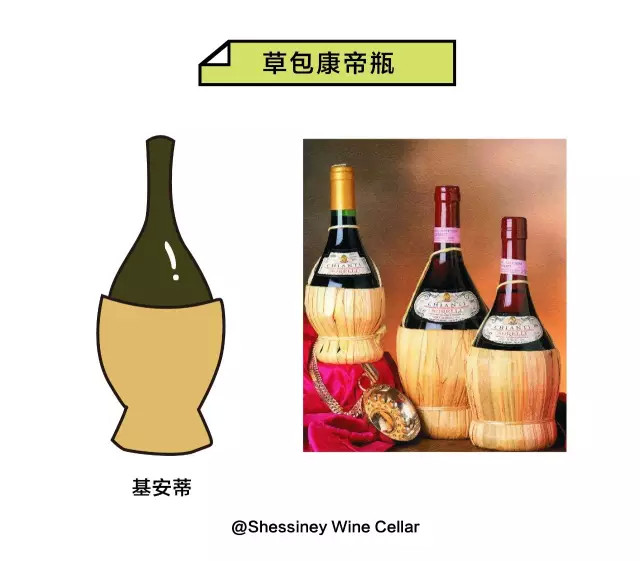 来自于意大利的托斯卡纳(Tuscany)的Chianti相信很多人都喝过。但是包成这样的,你很可能没见过,但是这是当地最传统的酒瓶之一。当时的圆形玻璃瓶更易吹制,且包着草编的外衣,易于运输。如今,这样的瓶形已经越来越少,甚至一些地方被废止使用。所以在托斯卡纳我们还偶尔能在超市见到一些,或者在传统的小餐馆喝到用草包康帝的自酿酒。