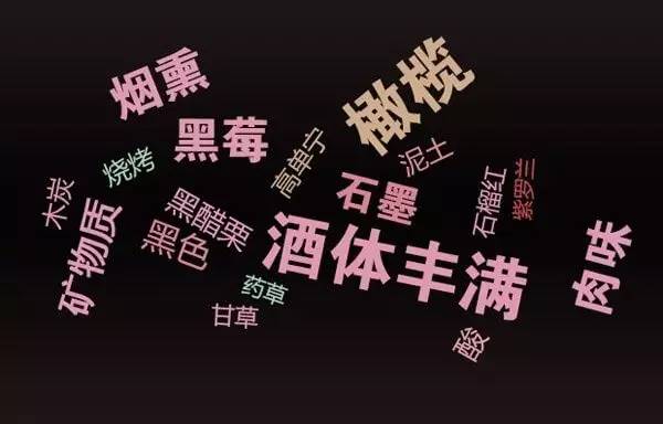 其他:橄榄、胡椒、丁香、香草、薄荷、甘草、巧克力、甜胡椒、迷迭香、腌肉、咸肉、烟草、药草和烟熏味