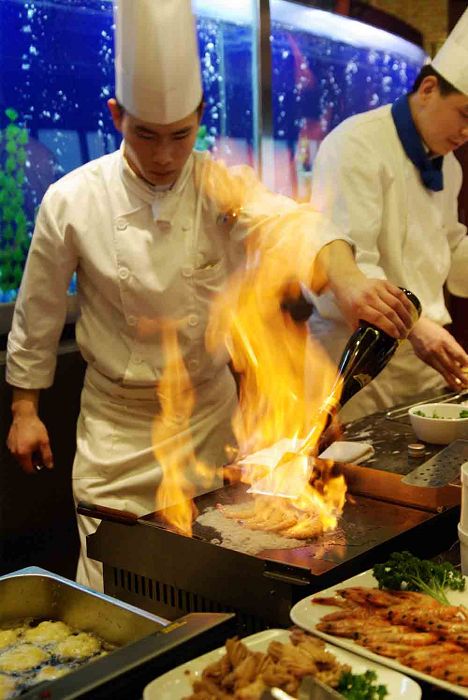 旋景餐厅最有特色的就是开放式厨房。厨房位于整个餐厅的中央,宾客在品尝美食的同时还可以欣赏大厨们精彩的厨艺表演。来自意大利、香港、印度和奥地利的名厨们各自为阵,手舞足蹈地准备着各国美食。无论是西餐、中餐、日本料理还是印度菜,都地道而原汁原味。