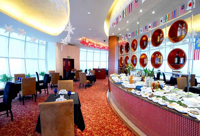旋转餐厅做自助餐的确是最好的选择。菜品摆放在四个区域,分别是冷菜区、热菜区、甜品水果区、扒点档,客人无论坐在任何位置,都能随便地取用自己心仪的食物。餐厅的行政总裁是香港人,他对于餐厅的食物有一种偏执的执着。对于原材料、制作、装盘、摆台,都有自己的想法。餐厅不定期地举办美食节,比如意大利美食节、东南亚美食节、新西兰美食节……不同季节提供不同的食物。