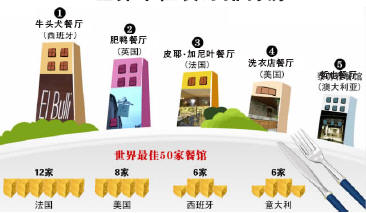 英国权威餐饮杂志《饭馆》刚刚评出世界最佳50家餐馆,西班牙人亚德里亚和他的“牛头犬”餐厅成为大赢家,占据了由该杂志举办的圣佩里格里诺国际餐厅颁奖礼的榜首位置。在50家餐馆中,法国有12家、美国有8家,西班牙和意大利各有6家。《餐馆》杂志的编辑们还首次设立了一个“突破奖”,英国名厨戈登·拉姆赛的“迷宫餐厅”及其主厨詹森·阿瑟顿获此殊荣。