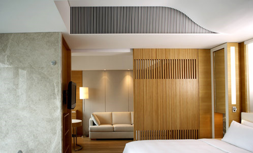 香港人工昂贵,自然无法像东南亚度假村一样拥有住客和服务员的高比例,设计师则通过设计让服务更为周到和快速。走廊的房门号码设于天花板,亮起绿灯表示房间需要打理,红色则请勿打扰。服务员就算在走廊尽头也一目了然,自然能马上为客人服务。房间内的洗手盘摒弃了大理石,采用便于清理的雅克力物料,也是同一原理。