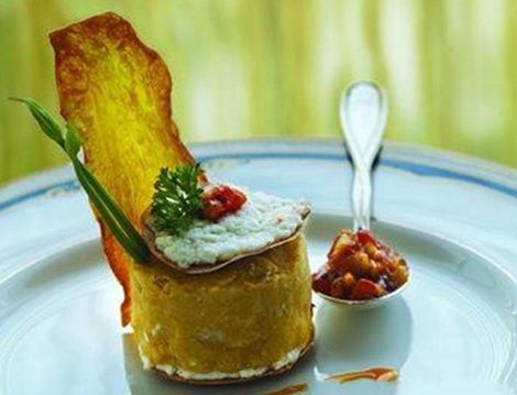Cream cheese和Ricotta都是一种新鲜乳酪,口感滑腻,淡淡奶香,不论是细腻的蟹肉甘薯泥中,还是那“屋顶”上的厚厚“白雪”,cream cheese和Ricotta cheese都以细滑甜淡的味觉特点为这道菜增色不少,而炸到脆极的甘薯片和酸爽微辣的那勺沙拉更是令人眼前一亮的惊喜。