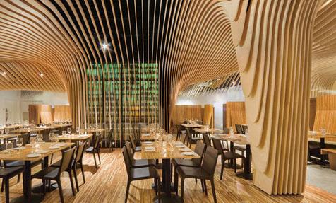这是一间由美国设计工作室Office dA在波士顿打造的Banq酒吧餐厅。全木质的波浪天花板造型是这间餐厅的最大亮点,带给人一种特殊的轻盈之感。我们可以清晰的看到木质波浪造型装饰的每个特点。木制装饰不仅能带给人一种温馨舒适的感觉,还能在设计上带给人一种绝对的现代元素。