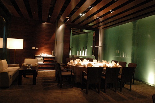 餐厅在西湖边凯悦酒店一层,江南大宅风格的设计端庄含蓄,许多江南一带收集来的古物成为独具一格的装饰,用厚重的古代木门制成的餐桌令许多人过 目不忘。餐厅中间有一个全透明的步入式酒窖,有新世界和旧世界超过2000瓶的藏酒,客人可以走进去亲自选酒,成为这里的一大特色。