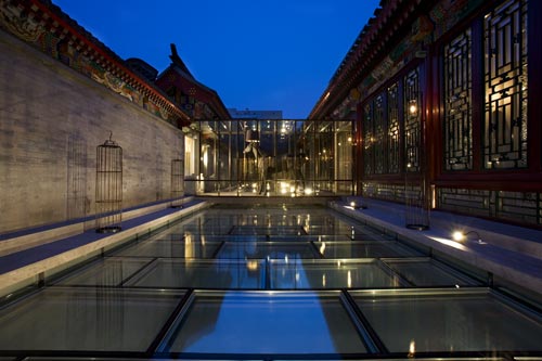 在现代商业气质甚浓的金融街,你很难想象,这里还有一座幽静古香的四合院,它灰砖灰瓦并不抢眼,独善其身的位于高楼林立之中让人颇感特别。而更特别的是,你进入店里便发现,古典外貌的庄重只是它的一种模样,黄浦会的软装更让人一见倾心,四合苑的前庭部分的地面,大手笔地被半透明玻璃替换,演变成美仑美幻的荷花水池,而在地下一层用餐的客人也能感受波光粼粼、生气勃勃的氛围。地下一层用鸟笼改装的吊灯,错落有致的悬挂在玄关的屋顶,光线在鸟笼的空隙中相互挤闯,光影陆离。餐厅内部环境由曾经设计过外滩三号项目的Lyndon Neri精心设计。在四合苑特有的浓郁中式情怀之中,加入了自然的元素和先锋前卫的装饰手法,黄浦会菜肴也在传统中国菜的基础上,把创意才情与当地菜系特色相结合,碰撞出惊喜——它以创意京味为主的菜品,糅合了北京美食特色。