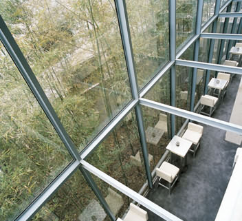 大堂里最佳的风景是玻璃墙后的那片竹林。翠绿的枝叶为这个清冷的空间增添了几分生气。枯叶新绿交替,随风舞动的韵律, 虽然是隔着玻璃,但你仍然可以感觉到它生长的气息。因为它是这里唯一有生命的成员。