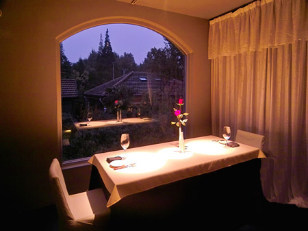 餐厅里是暗暗的格调,只有一盏聚光灯幽幽的照射在桌子中央。服务生因此身上都挂着小小发光的饰件,随着服务生在幽暗中的行走宛若一只只漂浮在空气中的萤火虫。