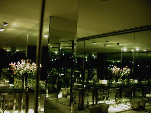 店里的另一个特色是厕所。不要急了才去上厕所,那样可能因为到了厕所门口不得其门而入而酿出惨祸。厕所外面照例没有男女指示标记。服务员只会向你努努嘴告诉你厕所的方位。可是你眼前会出现一模一样的6~7扇门。有的人会因为自己的误区推不开一扇门。常看见生客在那个小小的布满六扇门的门廊里象白鼠一样的窜来窜去,满脸困惑。怎样进门照例不说,还是自己去发现才会有趣。