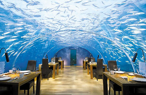 马尔代夫“Ithaa”(马尔代夫土著语中意为“珍珠”)餐馆是世界上首家海底餐馆,位于伦里芬湖岛希尔顿度假村与水疗馆区。该餐馆的主体结构为丙烯有机玻璃,位于海平面以下5米。