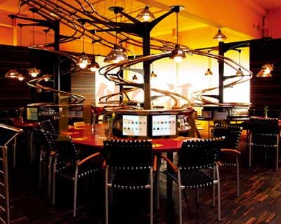 这是一家没有服务生的餐厅,而且厨房设在天花板上。每张餐桌上都是机械装置和电脑屏幕。顾客按照语音提示,通过餐桌上的一个电脑触摸屏幕点菜。厨师做好菜之后,一节小车就会装着食物开出来,顺着螺旋状轨道“空降”到餐桌上,而饮料或者啤酒也顺着这个轨道流进餐桌边的容器中。