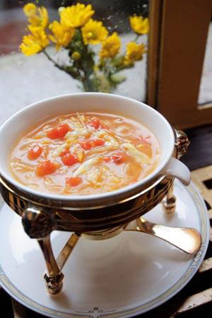 好比这几道,“细风轻露,芥末西汁裹脆虾,桃花笑”、“落花水香,豆酥雪菜蒸鲜鱼”、“天宇回,物华幽,黑椒排骨拌香饭”、“不须归,瓦罐土鸡汤,白鹭飞,斜风细雨”……食物的味道由大厨来保障,而餐厅经营者最费心思的是要在这都市繁华处营造一种“慢餐文化”,于是连点菜这一环都显得有点“只可意会不可言传”。