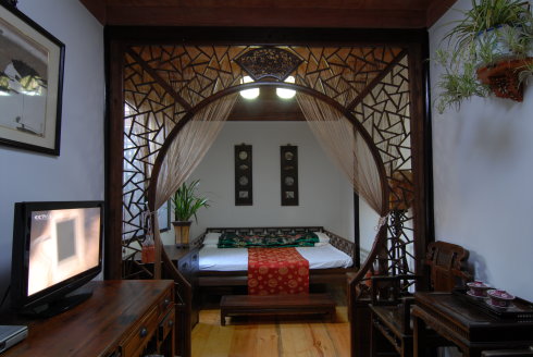 最后一家是根和民居客栈,也叫亨复堂。里头的古典房最有特色,雕花大床上挂着青纱帐,还有两个大大的中国结,别有情趣。