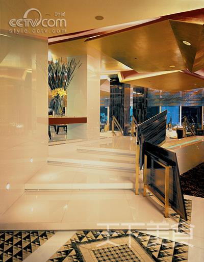 入门正面是摆满琳琅满目各式洋酒的整面玻璃酒柜与华丽垂下的灯饰。右侧区域是设有优雅火炉的宽敞会客区,而左侧则是实木书架倚墙而立沙发雅座的书房区。穿过其间的餐桌,来到开扬的厨房区域,里面设有由整棵大树躯干制成的大餐桌。而隐于北面两旁植有竹子的露台区则有着最壮观的地王大厦的都市夜风景。