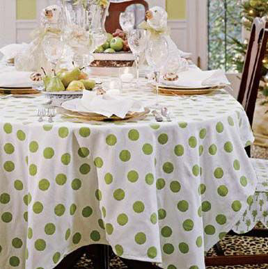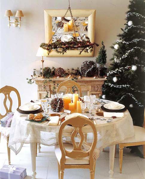 搭配亮点:这绝对是一个绝妙的搭配,田园的清新气息一展无遗。在这里,没有刻意用盆栽来营造田园风情,而是将这种风情的展现用具有田园风格的餐桌布来体现。淡绝色圆点的餐桌布,以白为底色,清新怡人。而在餐桌旁放置一棵圣诞树,具有田园风光的圣诞餐厅便形成了。