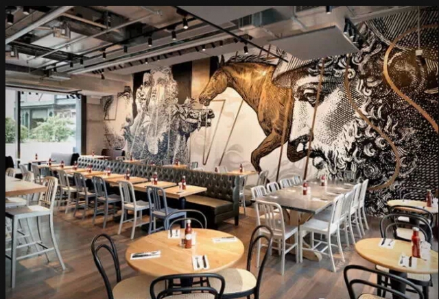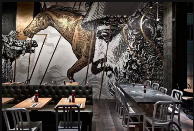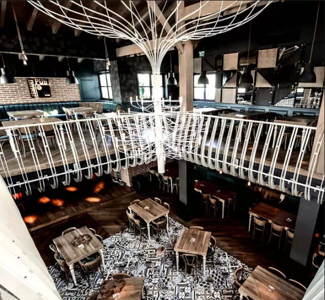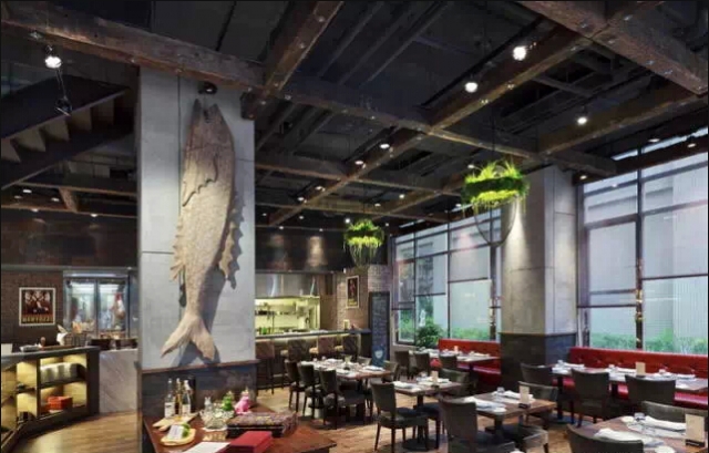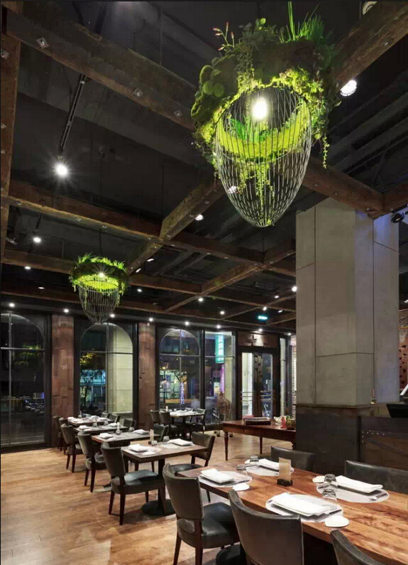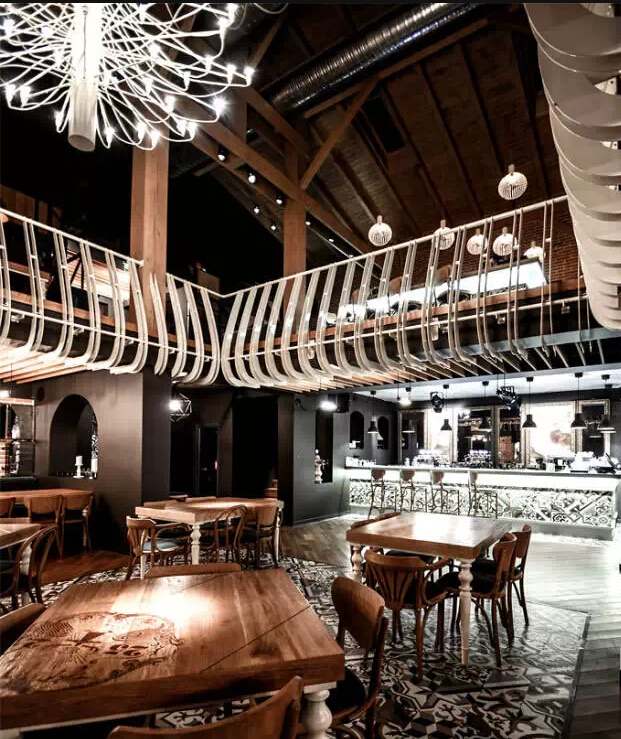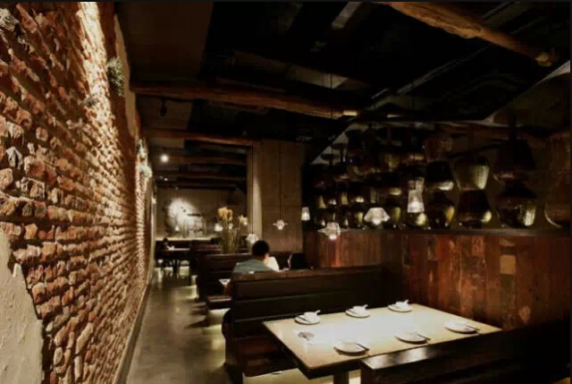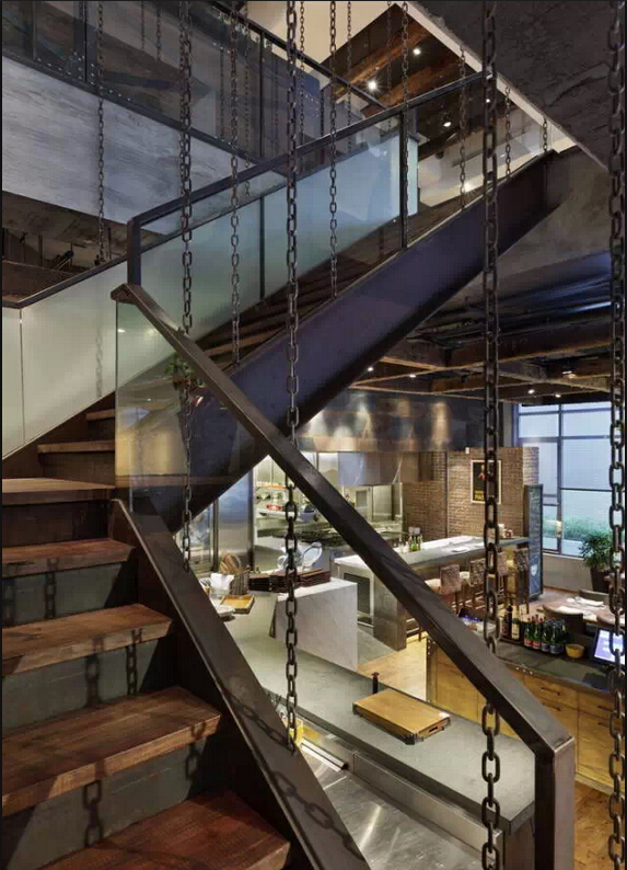 一般装修风格的餐厅太过普通,奢侈华美的风格也太常见,采用古旧工业的模式是当下最热门的装修风格。进这家餐厅,你会有一种破败的奢华感,这里有华美的齿轮,精美的地砖,整个餐厅墙面是裸露的墙砖,墙面上的艺术壁画别具一格。粗糙毫不掩盖的墙上,看似年代久远的挂画与其相呼相映。店内早就生锈了的铁制楼梯,走上去有铁器的响声。这里不像是餐厅更像是个豪华的的老旧工厂。