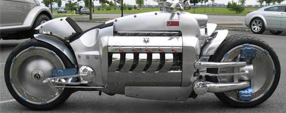 技术上讲,这台车是本文中唯一不属于摩托车范畴的车辆。它由毒蛇V-10引擎提供500匹马力,是四轮车辆。根据国家公路交通安全监管机构的条文,地面上任何超过三轮的车辆不算作摩托车,这或许就是该车没有量产的原因之一。这不过是一台由引擎和几个轮子制造出纯粹速度和动力的机器,有点可惜。
