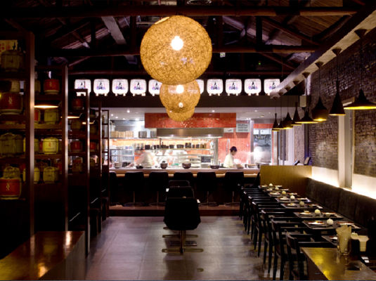 餐厅的设计以木材及花岗石的天然颜色为主,充满现代气息的灯光及堆放着的清酒桶,增添了不少日式时尚氛围。食客可以围坐在炭火烧烤架旁,一边享用美食,一边欣赏大厨在开放式厨房精妙绝伦的烹饪技艺,以及餐厅充满活力的前卫设计。