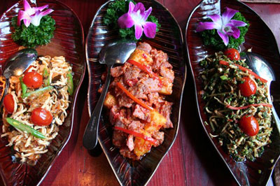 走进餐厅,仿佛走进了另一个国度,深红色的主基调,昏暗的灯光,随处可见的佛像,还有拨动人心的靡靡之音。至于菜,说是云南菜,其实更像是东南亚菜,蛮精致的,大部分的菜都配红红绿绿的蘸酱,酸、辣为特色。店里外国人很多,气氛相当小资。