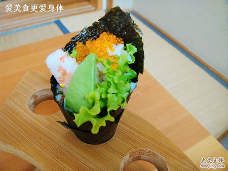 4、手卷:把寿司卷成圆锥体状(类似冰淇淋甜筒),比较难用筷子挟,所以通常用手吃。