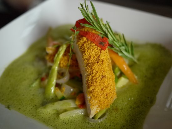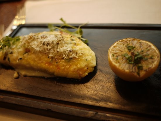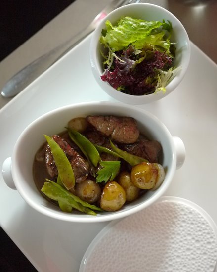 虽说午餐较晚餐简单许多,但这里也绝不是小餐馆(bistro)的风格,你依然可以在菜品里看到米其林星级餐厅的复杂传统,比如简简单单一道慢烤鸡胸配夏日时蔬和番茄粒佐罗勒叶汁,以本地农村放养的鸡为主角,经低温慢烤后鲜嫩多汁,再加上厚厚的一层番茄酥皮(Tomato Crumble),佐以夏日时蔬和罗勒叶泡沫,构成了汁肉宛相俱、香气四溢的口感。另外,这边午餐套餐的甜品最值得称赞(你知道法国人做甜品是很有一套的!),这里的每一个甜品都有声有色,可圈可点。个人最喜欢的甜品是烤芒果配松脆椰子粒,烤热后新鲜芒果被覆上厚厚一层酥脆可口的椰子粒,再配上香草冰淇淋,构成了一种冷热相间的幸福口感。另外,我还很喜欢马鞭草味煮蜜桃佐红酒冰霜这道甜品,口感非常清爽。