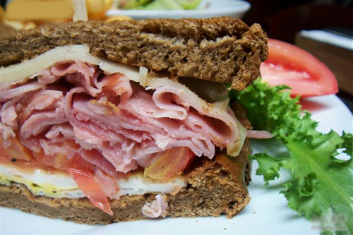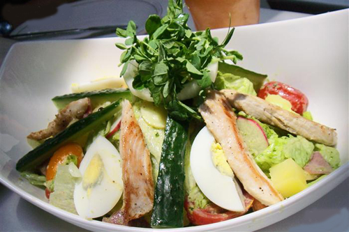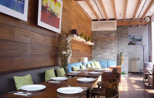 “隐藏”在一个弄堂里。推开半开半闭的小铁门,“苹果绿和白色”交错映入眼帘,“清新、明快”。餐厅分成三个部分:通透的玻璃房、露天的小院子、时尚与古典交融的洋楼。桌子的间隔很小,有些“拥挤”。食物的选择很多,汤、色拉、扒、意面、汉堡、甜点都有,味道都还不错。点上一份烟薰三文鱼三明治,配搭核桃粗粮面包,再加一杯鲜榨的橙汁,坐在玻璃棚里的大树下,很惬意。