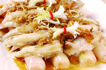 【白灼章鱼拼厦门土笋冻】:只要到厦门旅游,厦门人肯定会向您推荐这道风味小吃,厦门海沧有三宝,其中一宝就是这土笋冻——土笋原是野生鱼沿海江河入海处咸淡水交汇滩涂上的一种小海鲜,较为难得,富含丰富的胶质,土笋被从沙子中捕捉后,需先放养一天,吐清杂物后,方可下锅熬煮,因自身富含高度的胶原蛋白,熬煮后土笋盛在小碗里自然冷却之后,就成了一碗美味的土笋冻,土笋冻其肉清,味美甘鲜,搭配蘸酱,吃起来很清爽很香嫩。
