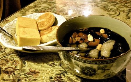 招牌烧仙草,可爱的爱心杯子,下面有蜡烛加热,周围一圈配料,有:红豆、水果、珍珠等,非常喜欢,味道也很好,大爱!