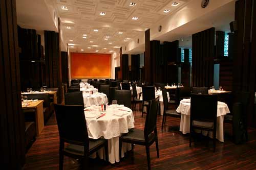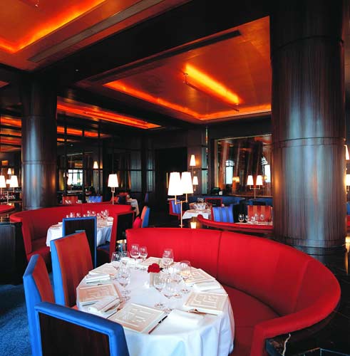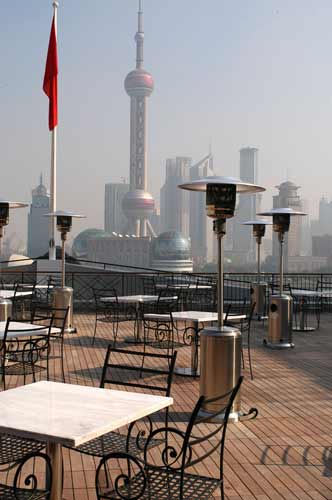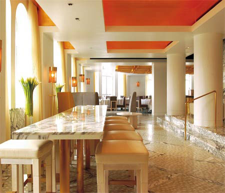 人们在描述一个人地位时,不说他有多少钱,只说一句:他在Jean Georges用餐。这个在世界范围内被富人们所追捧的餐厅如今落户在这里,与外滩三号所追求的富贵气质倒显得相得益彰。餐厅不仅拥有1500平方米的空间,还有挑高5米的大堂。高高的窗户可以观黄浦江的景色,挑高4米的屋顶覆盖了铜箔,这个造型让人觉得置身于一个巨大的金色喇叭下。餐厅里的家具都是些深酒红色或钴蓝色的美洲核桃木,休息区内有马鬃低靠背逍遥椅,以及鳗鱼皮包裹的蛇行凳,吧台是赭石覆面,这些都是很值得玩赏的玩意。