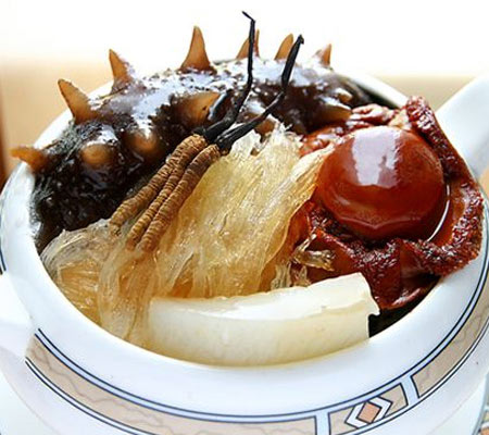 冬虫夏草炖三宝,主料是冬虫夏草、鲍鱼、鱼翅和刺参,都是大补的食材,口味软糯鲜滑,汤汁香醇,有补五脏的特殊功效。