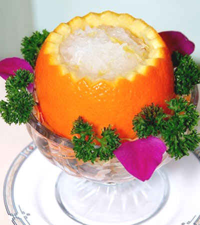 这道冰橙燕窝清新诱人,口味香甜,性味甘平,可消热解燥,滋润肌肤。燕窝是金丝燕口里吐出的唾液凝结而成。主要产区为南洋群岛的峭壁崖洞之中,其中以印度尼西亚产量为最大。