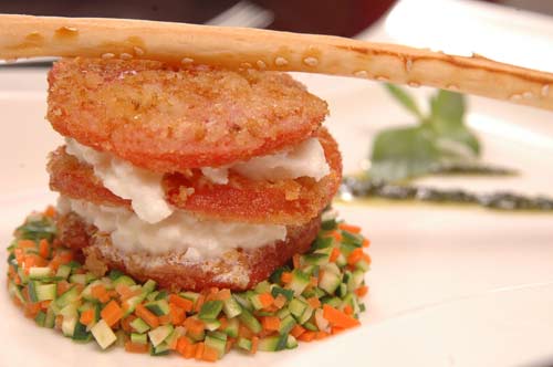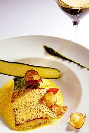 两位主厨做的法国菜,首先是一种绝对的视觉享受,味觉上自然更是多有独到之处。比如他们出品的特色草莓提拉米苏,第一次让人看到提拉米苏的每一层原来是可以如此分开来摆放的,硕大草莓的外皮用细碎的白砂糖稍稍粘了一层,几颗桑葚浇上浓浓的酱汁,一根手指饼干,一小团奶油幕丝,搭配在一起,造型雅观,色香味三绝。
