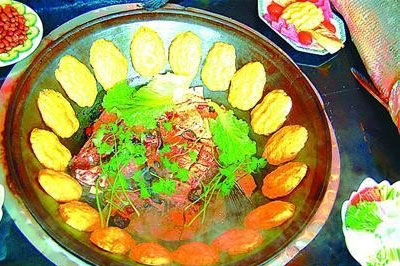 吃法跟火锅差不多,先挑鱼称鱼,每个桌子上有个大锅,然后专门的汤料和鱼下锅,一般要等20分钟,里面再加上自己点的配菜,配菜和外面的火锅差不多,素的品种多一点,也有冷菜,可以点一些打发等的时间。马哈鱼非常非常鲜,肉质很好,外面有一点点老,里面非常嫩,不能煮太多时间,不然里面也会老的。那里的玉米饼也很有特色,是现做的,把玉米糊捏成一个个小饼,然后就贴在鱼锅上直接烘,鱼熟了,饼也好了,很香,沾着鱼汤吃,很特别。